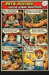 В комиксе «Личная гигиена» наш герой Петя вступает в увлекательную борьбу с армией коварных микробов! Вместе с ним юные читатели узнают какие еще секретные приемы помогут победить невидимых врагов.